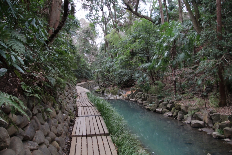 多摩川に合流する谷沢川の流れに沿って自然を生かしながら整備され、約1kmの遊歩道を散策していきます。